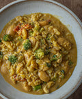 cabbage*, butter bean*, broccoli*, tomato*, onion*, garlic*, coconut milk*, fresh coriander, fresh curry leaves, black MUSTARD seed, garam masala MUSTARD, turmeric*, cayenne, CASHEW nut*, coconut oil*, pink Himalayan salt*